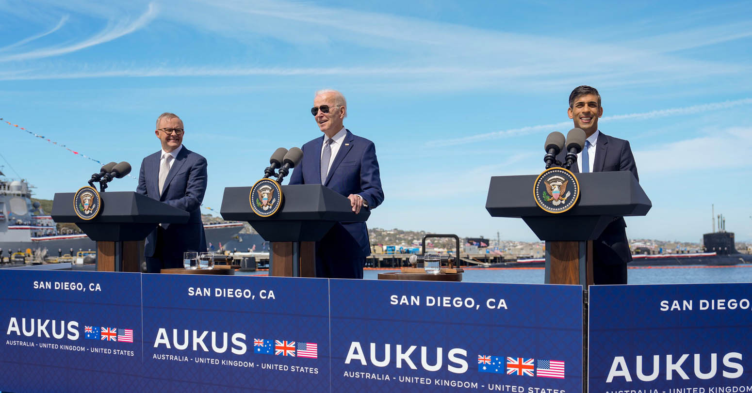 Biden flew to San Diego to appear with Australian Prime Minister Anthony Albanese and British Prime Minister Rishi Sunak as they hailed an 18-month-old nuclear partnership given the acronym AUKUS — for Australia, the United Kingdom and the United States.